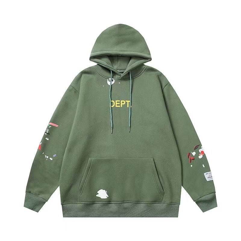 Crafted from high-quality cotton, this hoodie offers a soft and comfortable feel, perfect for everyday wear. The vintage green color gives it a retro vibe, while the distressed detailing adds a touch of edgy sophistication. The front features the word "DEPT." embroidered in a bold, contrasting orange, making a subtle yet impactful statement.