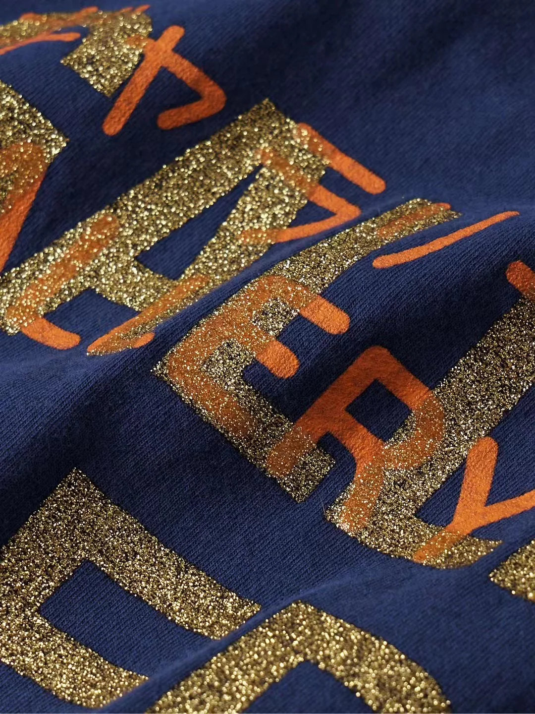 The back of the tee features an eye-catching "Gallery Dept." graphic in a striking gold glitter and multicolored print. This unique design adds a dynamic and artistic touch, making the tee stand out. The vibrant colors and glittery effect create a captivating contrast against the navy background, embodying the brand's commitment to creative expression and urban aesthetics.