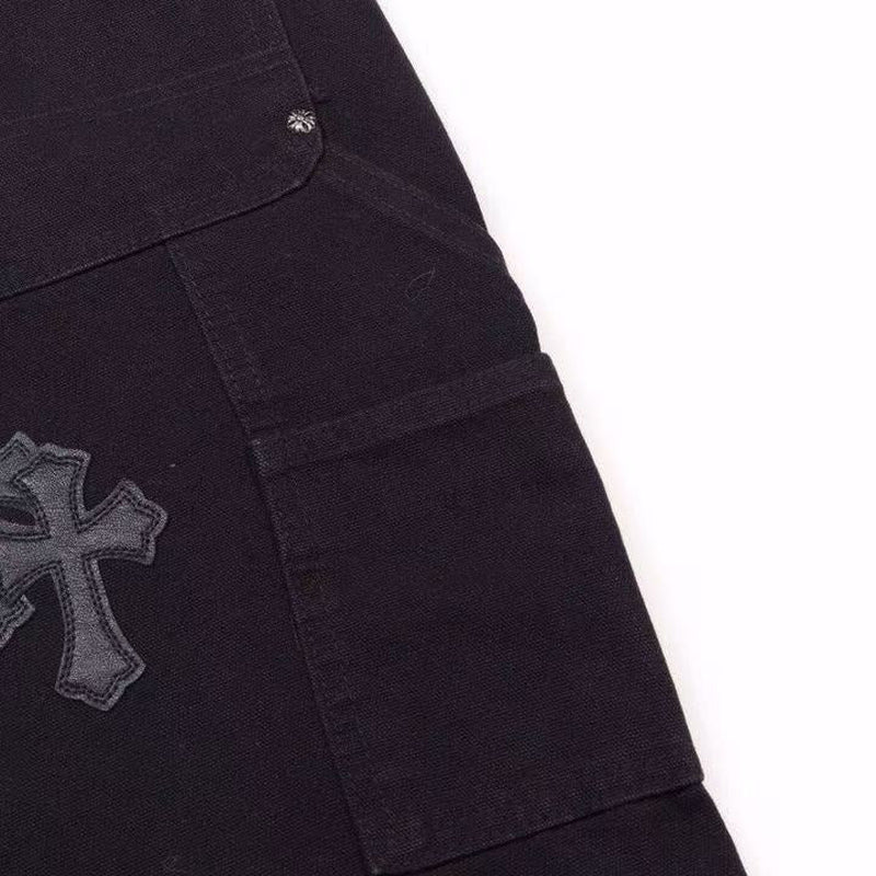 The CHROME HEARTS BLACK DOUBLE KNEE CARPENTER JEANS - REPLICA combine rugged utility with luxurious streetwear design. Crafted from durable black denim, these jeans feature reinforced double-knee panels for added durability and bold Chrome Hearts-inspired detailing, including signature cross patches and intricate stitching.