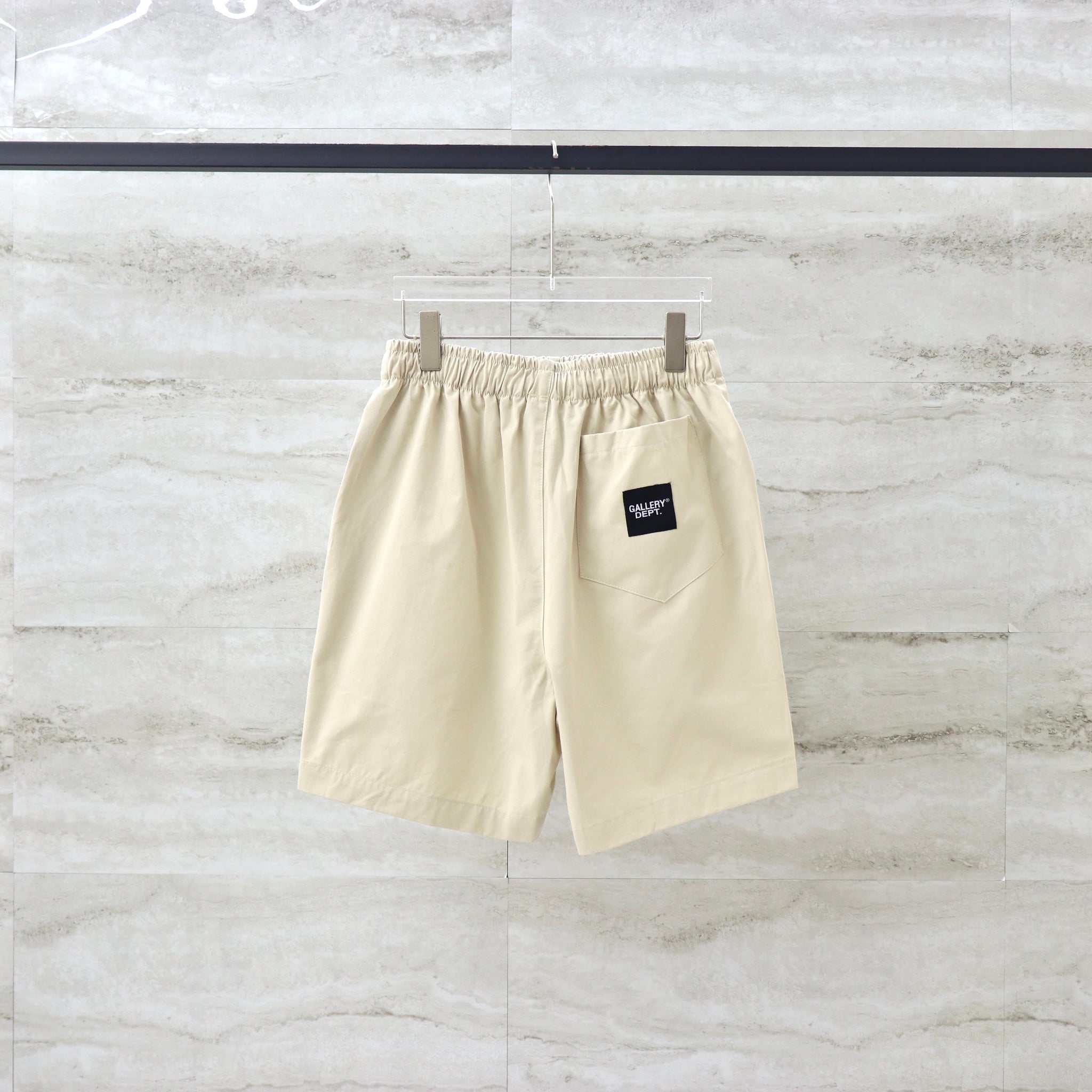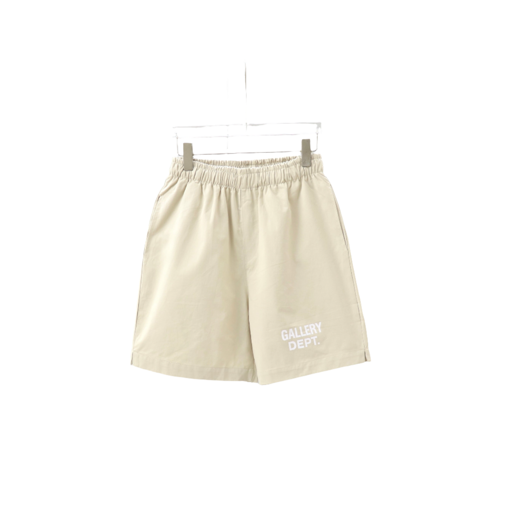 The shorts feature a clean, minimalist design with the iconic Gallery Dept. logo printed on the lower left leg in a crisp, white font. This subtle yet distinctive branding adds a touch of sophistication to the overall look, ensuring you stand out in a refined manner.