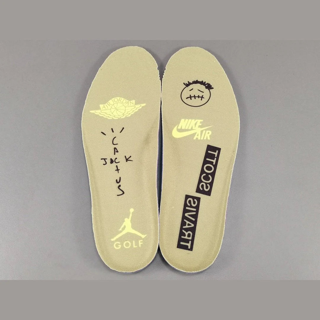 One look at these kicks, and you'll immediately notice the iconic stitched Travis Scott and Air Jordan branding on the heel, a mark of authenticity and exclusivity that sneakerheads crave. The Travis Scott signature reverse Swoosh on the lateral side of the shoe adds a distinctive touch that sets these golf shoes apart from the rest.