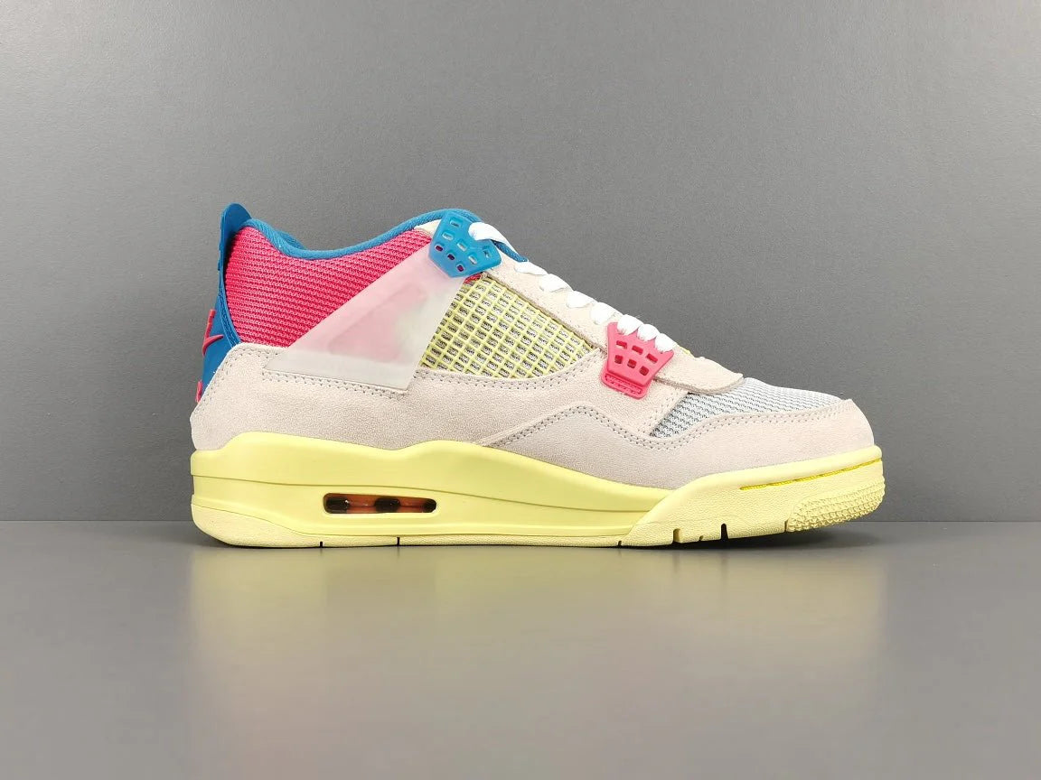 The upper of the Jordan 4 x Union Guava Ice features premium materials, including smooth suede and breathable mesh, in a delightful Guava Ice hue. This soft, pastel-like color exudes a sense of freshness and adds a feminine touch to the iconic Jordan 4 silhouette.