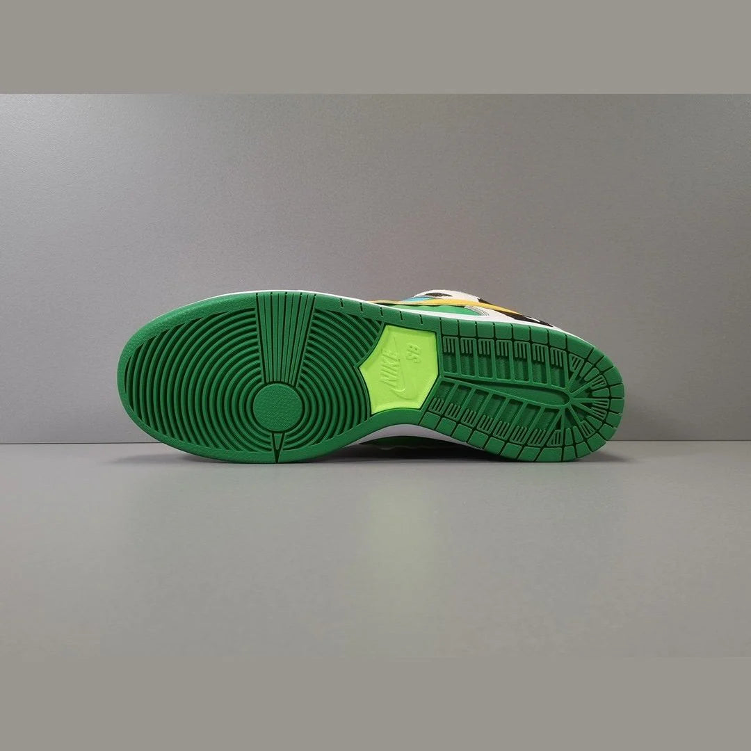 The Nike SB Dunk Low x Ben & Jerry's "Chunky Dunky" is a playful and bold collaboration that stands out in the sneaker world. Inspired by Ben & Jerry's iconic ice cream packaging, the shoe features a vibrant mix of colors and patterns, including a blue sky, green pastures, and cow print overlays. The premium leather upper is accented with melting Swooshes resembling dripping ice cream, embodying a fun and whimsical design. The padded tongue and Zoom Air cushioning ensure comfort and performance, making the "Chunky Dunky" not only a visually striking sneaker but also a functional choice for skateboarding enthusiasts and collectors alike.